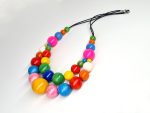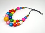 Posebna unikatna ogrlica čije su glavne komponente drvene kuglice ručno oslikane akrilnim bojama i lakirane za dodatnu zaštitu. Ukupni dojam je zaokružen dodavanjem ostalih metalnih komponenti.