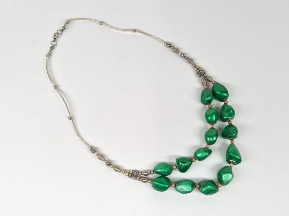 Posebna unikatna ogrlica čije su glavne komponente ručno rađene od Das mase te oslikane akrilnim bojama i lakirane za dodatnu zaštitu. Ukupni dojam je zaokružen dodavanjem ostalih metalnih komponenti.
