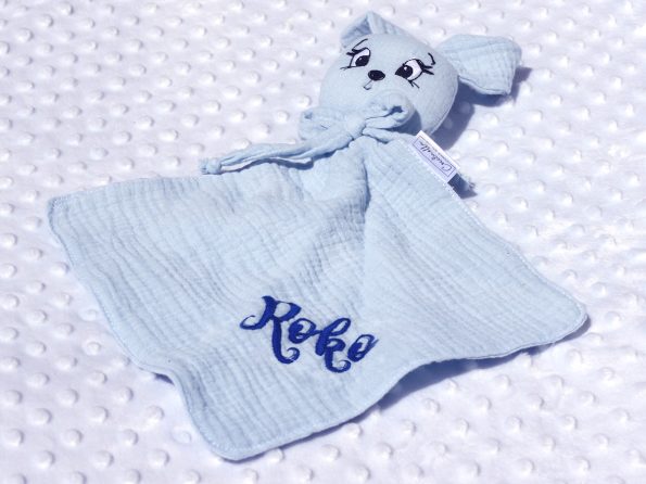 Napravljena je od mekanog pamučnog dvoslojnog muslina s efektnom mašnicom i strojno izvezenim imenom djeteta. Glava tješilice je punjena 100% silikoniziranim antialergijskim i antibakterijskim poliesterskim vlaknom.
