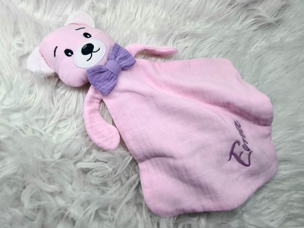 Napravljena je od mekanog pamučnog dvoslojnog muslina s efektnom mašnicom i strojno izvezenim imenom djeteta. Glava i ruke tješilice su punjeni 100% silikoniziranim antialergijskim i antibakterijskim poliesterskim vlaknom.