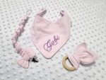 Ovaj slatki baby set osim što je prekrasan modni dodatak i možete ga sačuvati za trajnu uspomenu sadrži personalizirani slinček u obliku marame, vezicu za dudu i malu grickalicu / igračkicu za bebe.