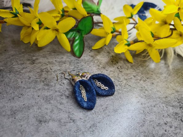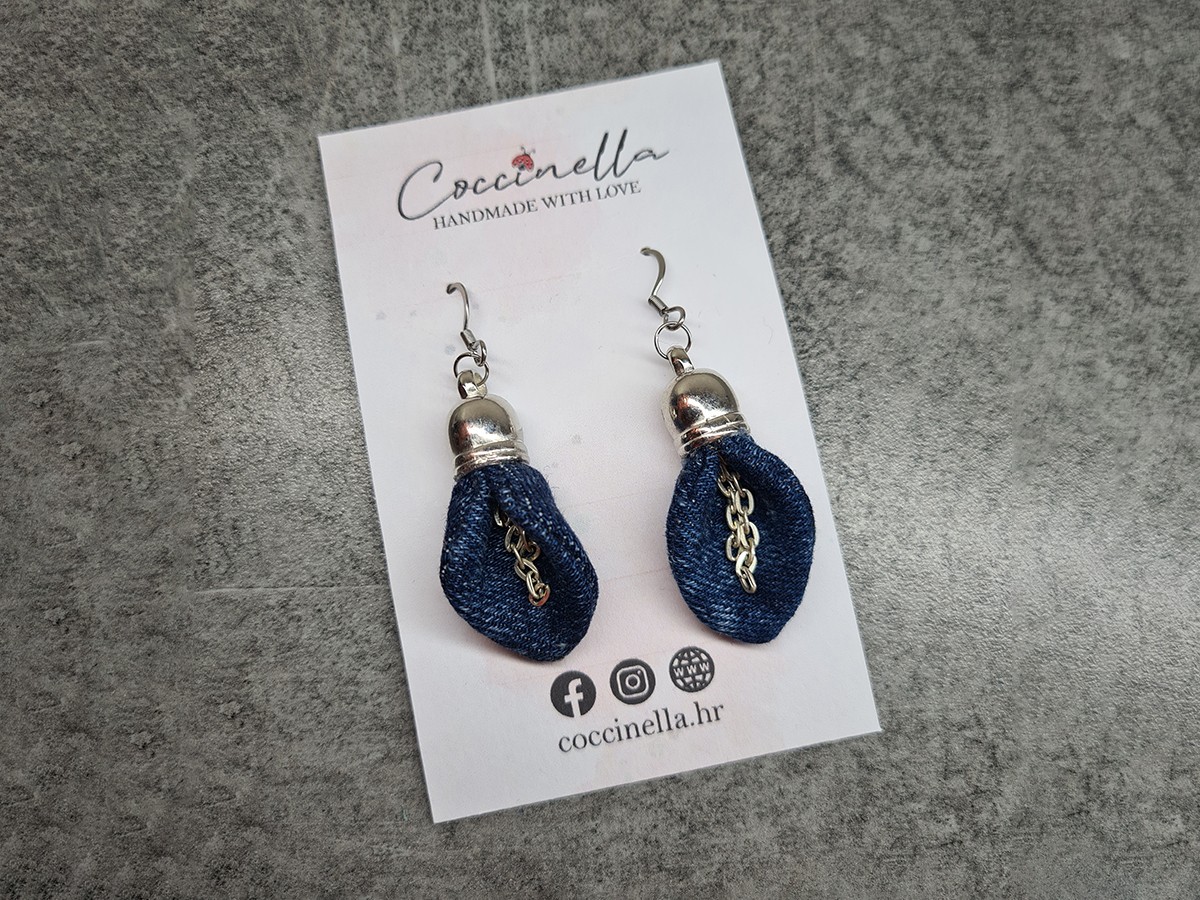 Lagane naušnice izrađene od traper materijala ukrašene tankim srebrnim lancem.